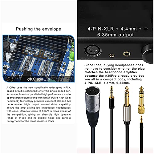 ♬ 4-pins XLR + 4,4 mm + 6,35 mm uitgang: sindsdien hoeft bij aankoop van hoofdtelefoon niet meer rekening te houden of de stekker bij de hoofdtelefoonversterker past, omdat de A30 Pro al alles in een compacte behuizing biedt, inclusief 4-pins XLR, 4,4 mm, 6,35 mm.