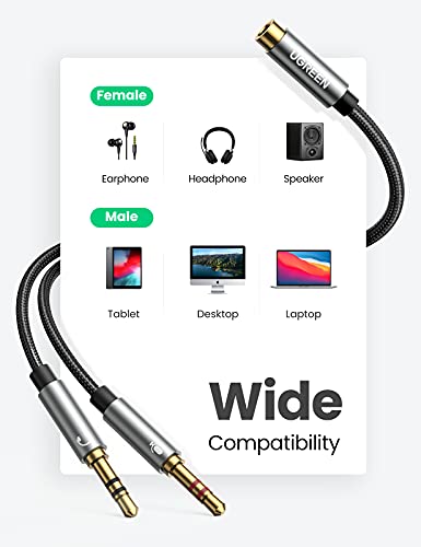 Specification: UGREEN 3.5mm Audio Splitter Kabel Headset en Microfoon Splitter Nylon Aux Kabel voor PC Laptop Headphone, 20 CM.